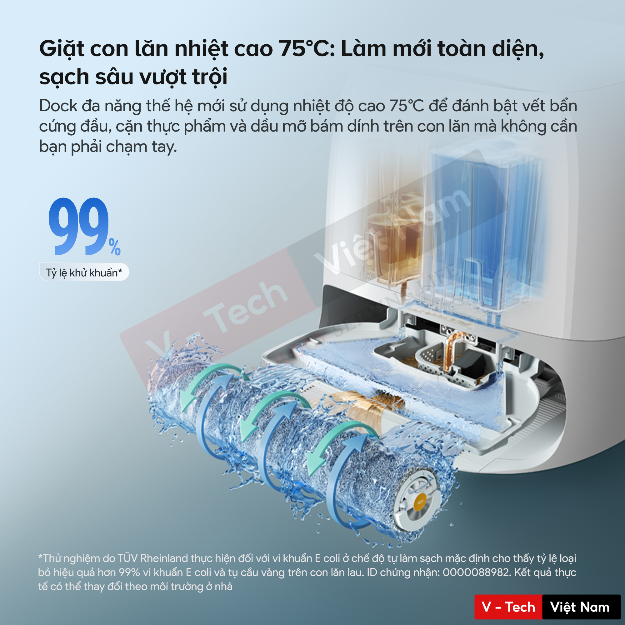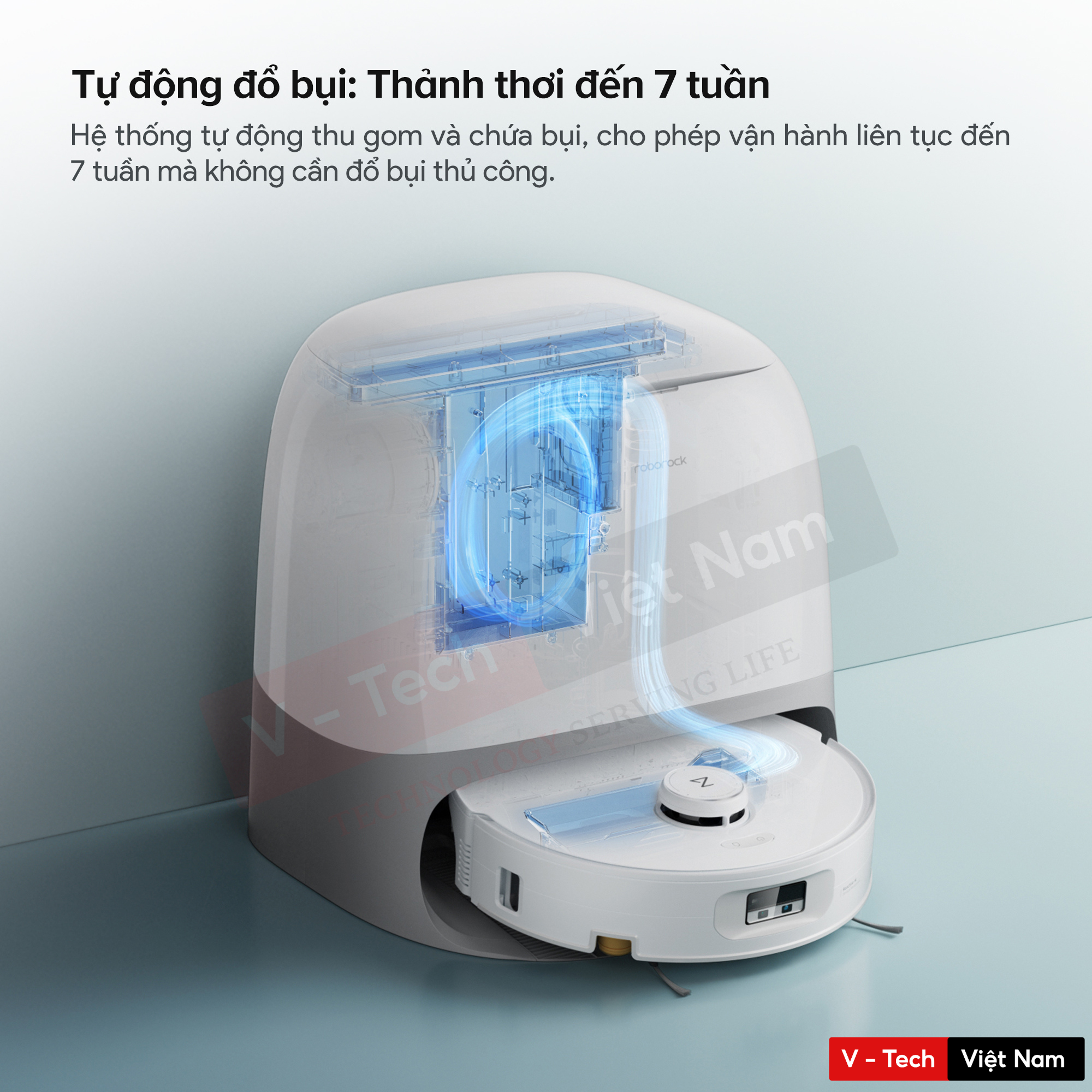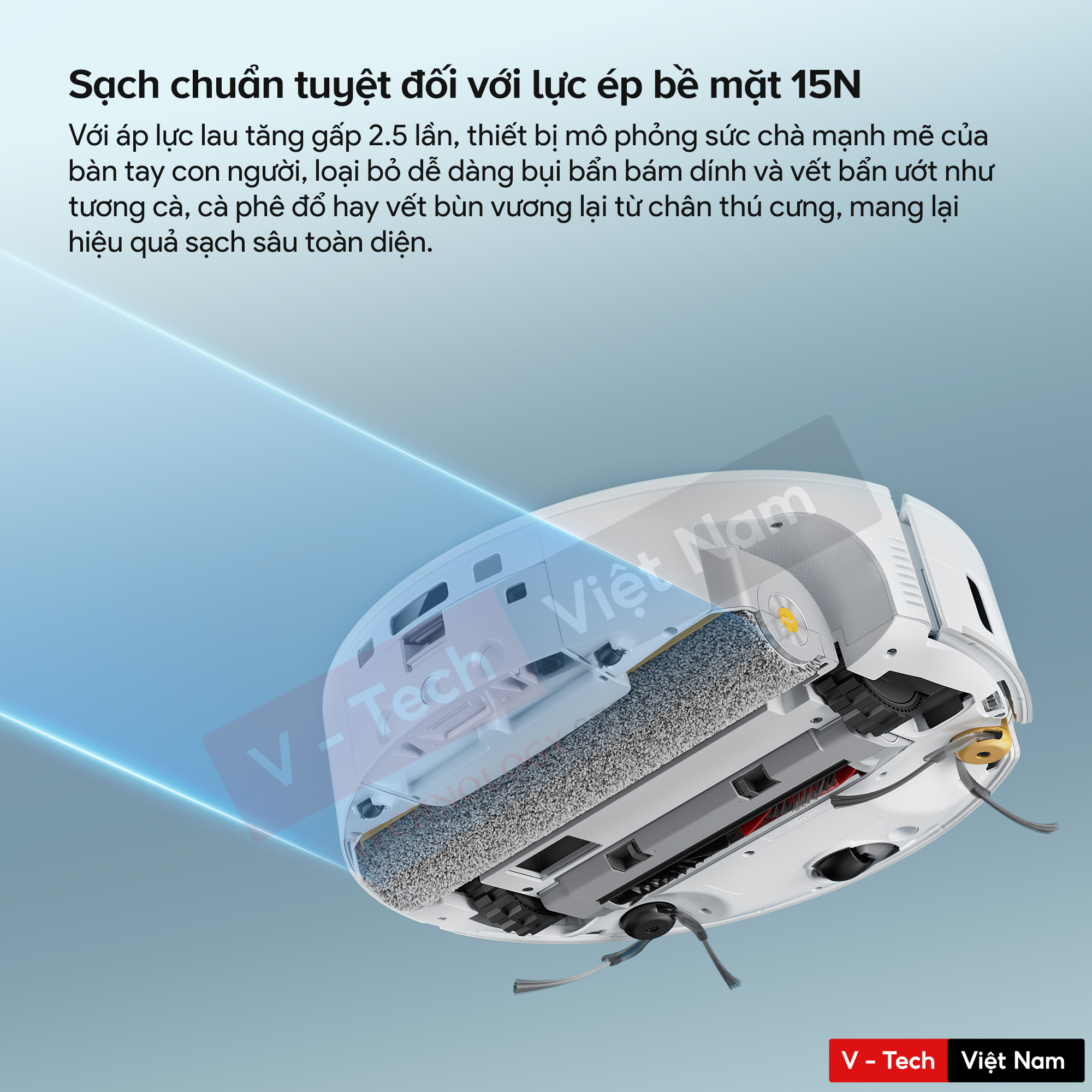 - Trạm tự làm sạch đa năng: giặt khăn lau bằng nước nóng 75°C, sấy khô 55°C, thu gom bụi tự động 60 ngày không cần đổ rác.