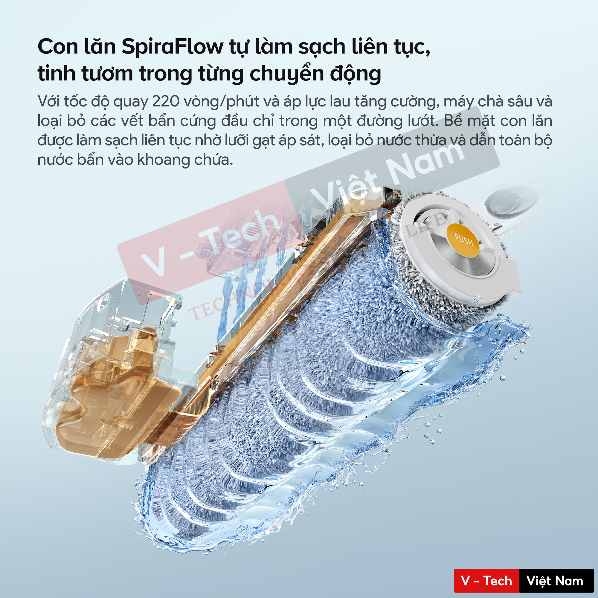 - Hệ thống SpiraFlow™ làm sạch 4 bước: phun nước – chà sạch – gạt bẩn – hút bẩn, đảm bảo khăn lau luôn sạch mới.